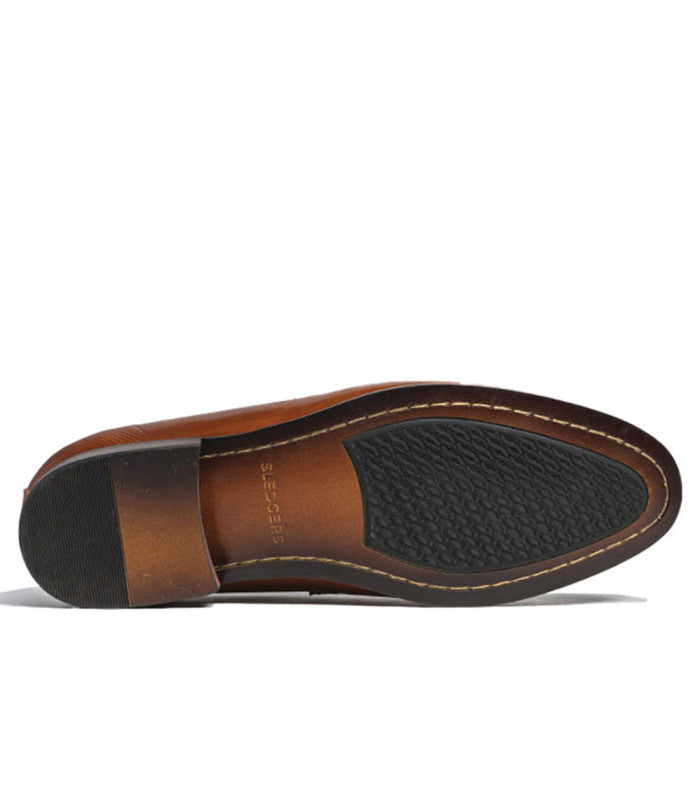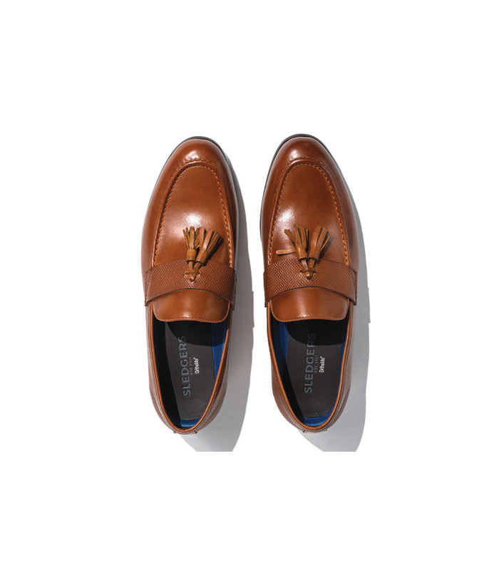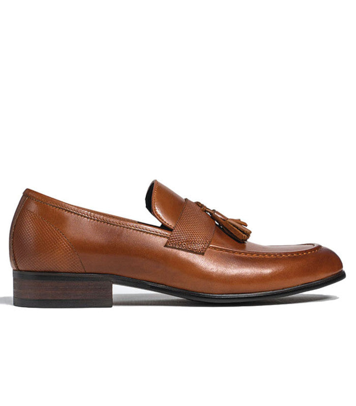 Tassel slip on with saddle and heel accents, providing a unique look to the classic loafer style.