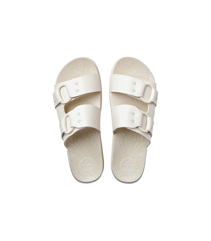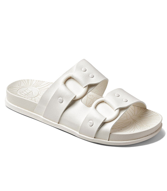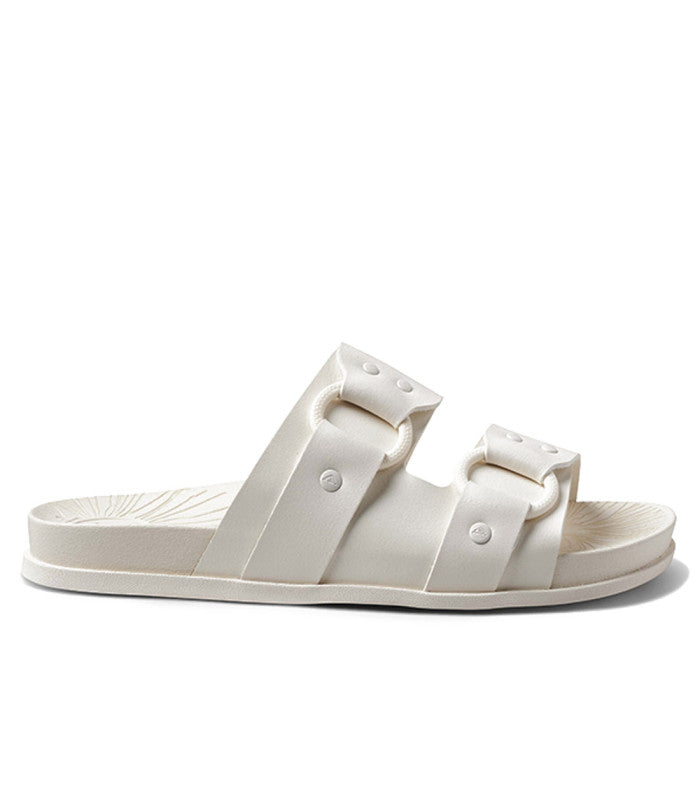 With nature- inspired details and soft vegan leather straps in a classic two- bar buckled design, this sandal will serve you from day to night in easy, casual chic style.UPPER Super soft unlined PVC Free vegan leather two strap slide with faux raffia molded buckles and recycled hardware detail FOOTBED Our most comfortable footbed featuring the perfect blend of cushion and rebound support.