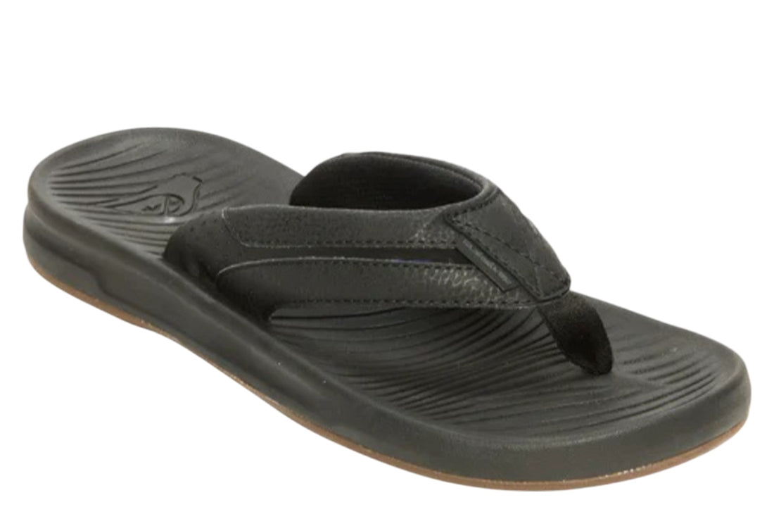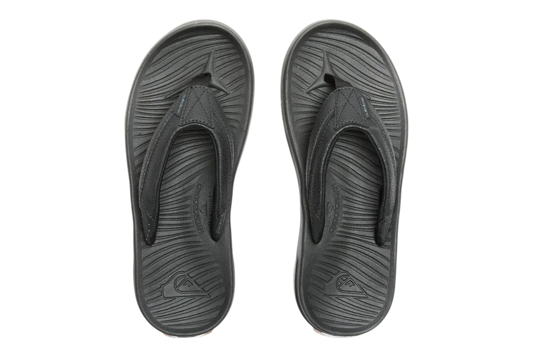 - Re- engineered gum rubber outsole incorporates multi- angled logo lugs for added traction Quiksilver Mens Travel Oasis Thongs - Sandals for men featuring nylon toe post made with regenerated econyl nylon fibres, and a soft Repreve recycled polyester jersey lining backed with memory foam for comfort.