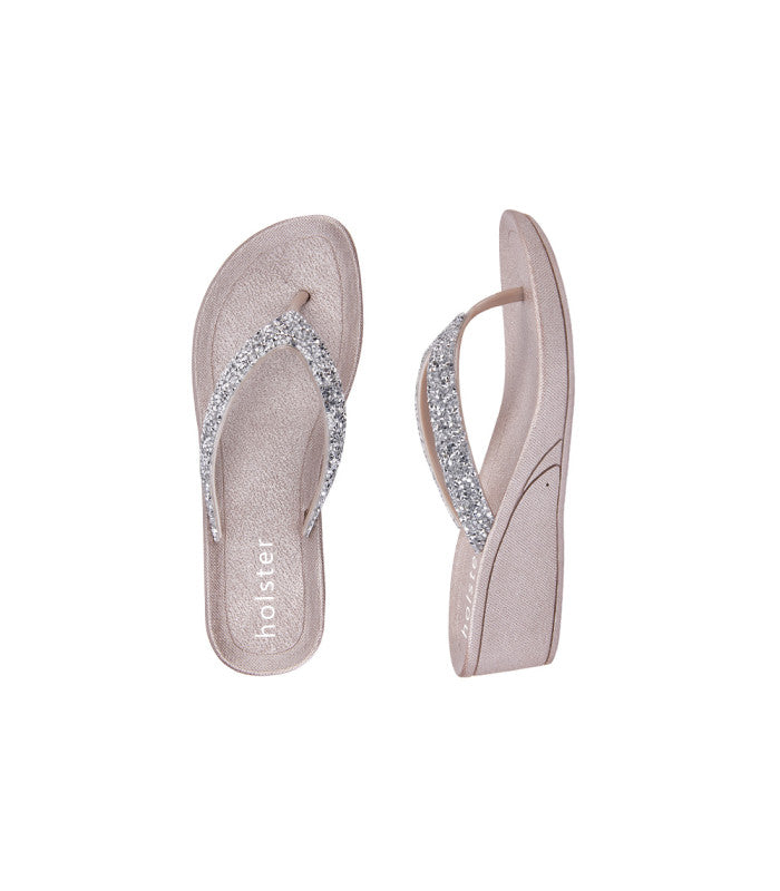 •Vegan friendly and PETA- approvedFeel sophisticated with our show-stopper Alora Wedge with its 5cm air-foam footbed and Y-strap upper glimmering in shining rhinestones.