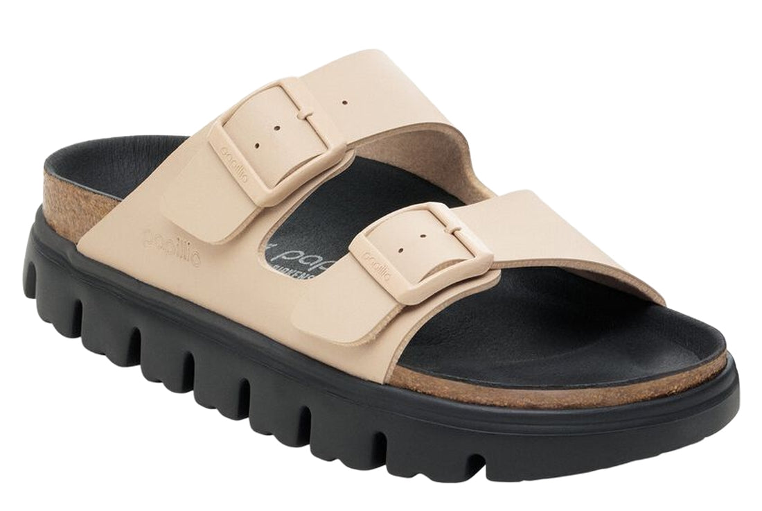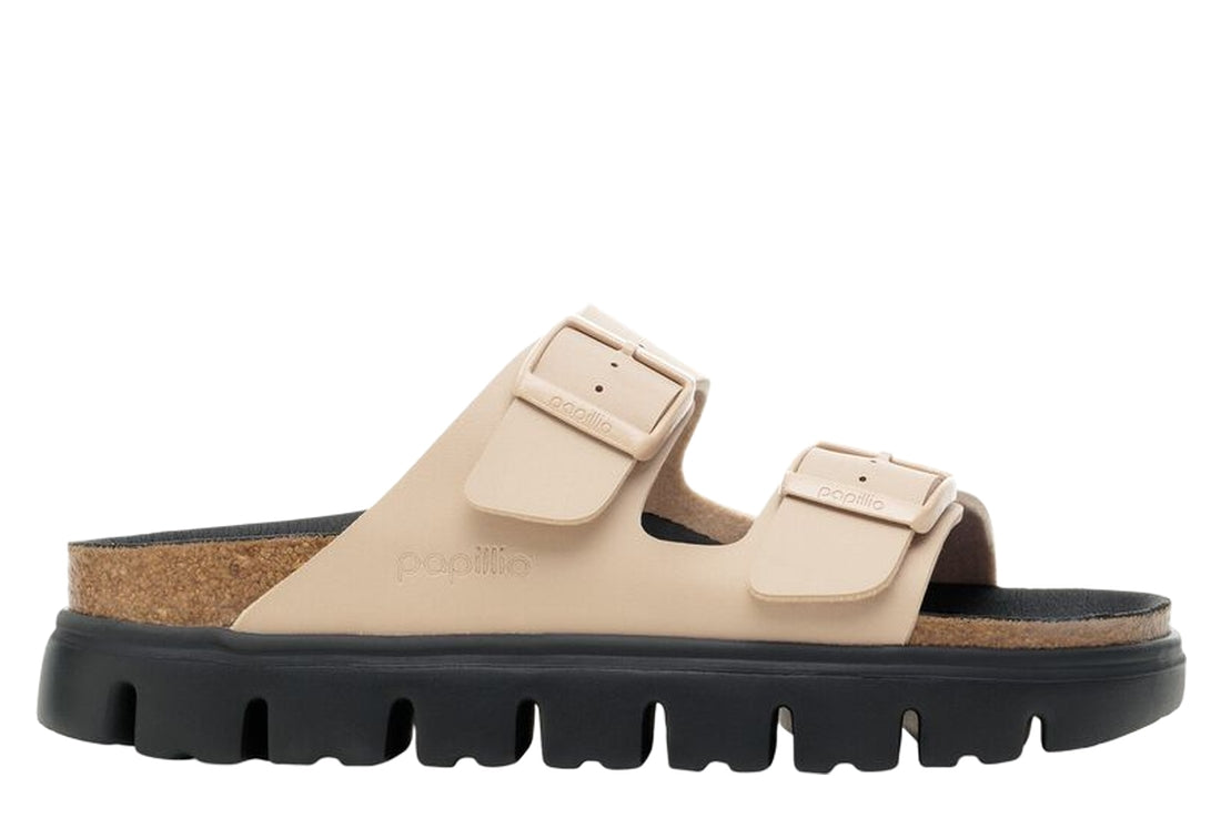 Here, Papillio presents the two-strap model with a stylish platform sole with extra deep tread lines.