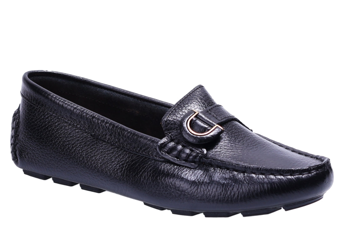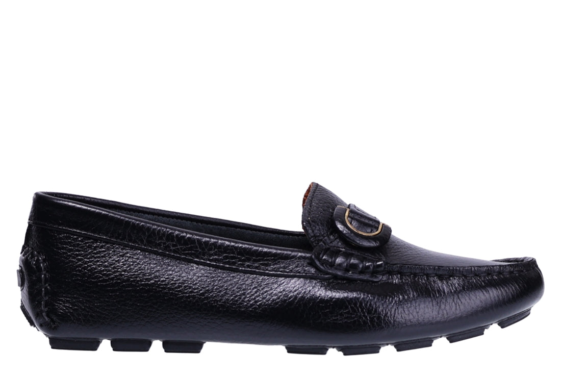 This leather loafer is styled with a round moc toe and metal hardware buckle accents that give it a fashionable finish.