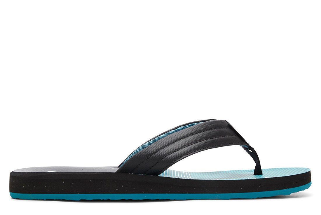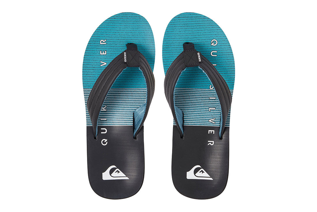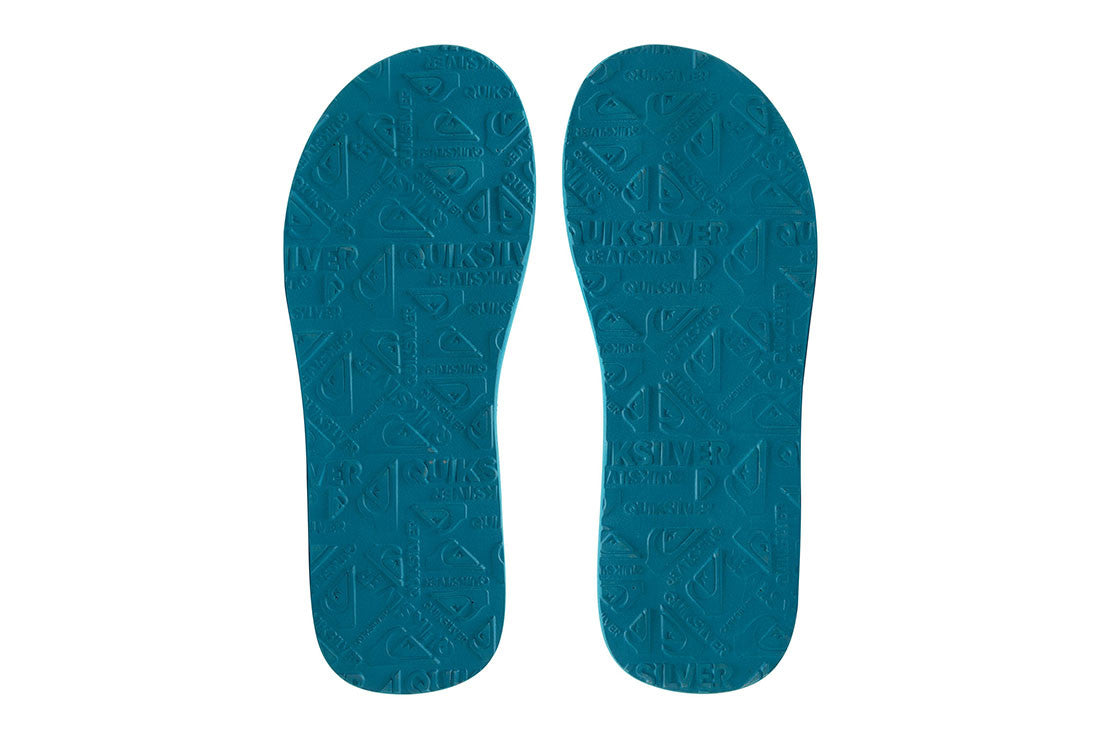 - Soft 5 point synthetic rubber strap with Quiksilver logo - Compression molded, textured footbed - Molded contour midsole with builtin arch, heel, and forefoot support - Gum rubber outsole incorporates multi angled logo lugs for added tractionMens flip-flops fashioned with a soft 5-point synthetic rubber strap with Quiksilver logo, and a compression moulded and textured EVA footbed, and finished with a moulded contour midsole with built-in arch, heel and forefoot support.