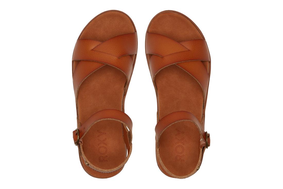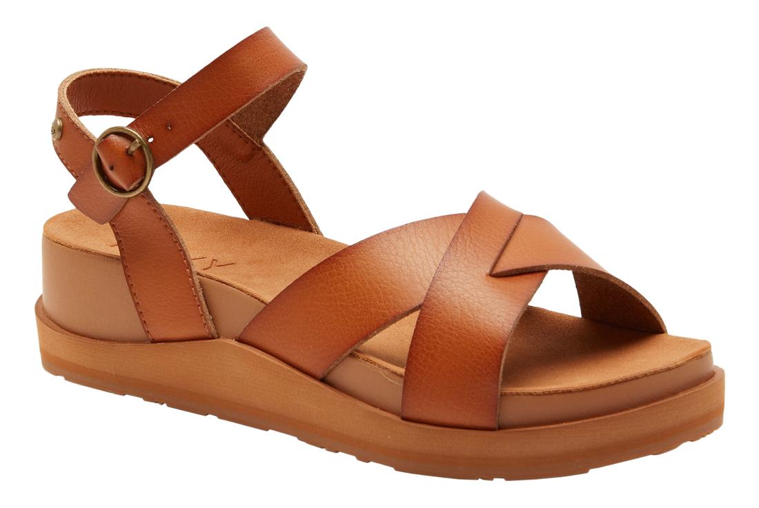 -Features: Style: Womens Sandals Colour: Tan Fabric: Synthetic faux leather upper fabric Upper Details: Synthetic leather cross strap sandal Footbed: Soft and cushy EVA with heel contour and anatomical arch support, finished with a vegan suede footbed cover Midsole: Ocean inspired wavy EVA midsole Outsole: TPR Roxy heritage outsole Closure:Adjustable buckle closure Lining: Synthetic lining Upper: 95% Synthetic PU/ 5% Metal, Lining: 100% Synthetic, Outsole: 100% TPRThe ROXY Kamila Sandal combine stylish design with all-day comfort and support.