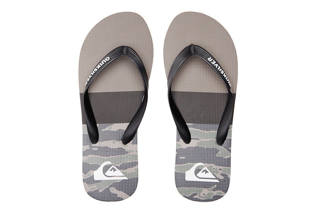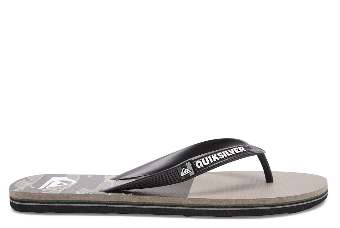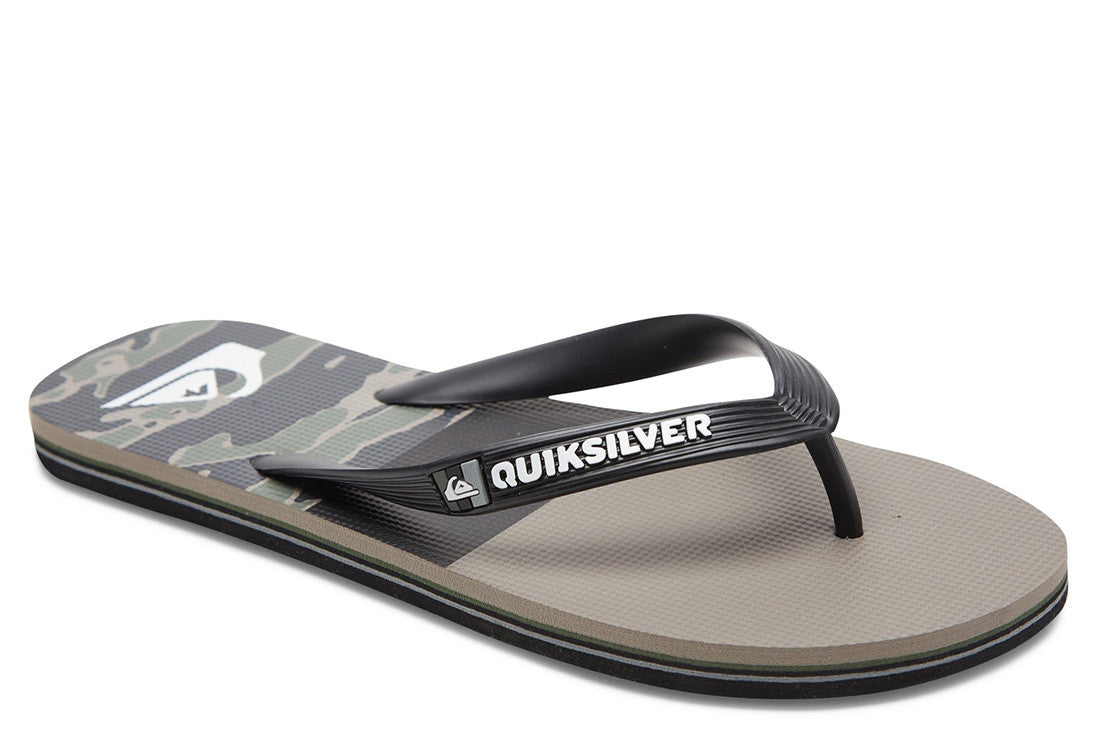 - Flexible 3 point synthetic rubber strap with Quiksilver wordmark and fine mold Mountain Wave logo - Slip resistant textured footbed - Pop color pin lines in sidewall tying into colorway - Re-engineered blown rubber outsole incorporates multi anglednlogo lugs for added tractionQuiksilver Mens Molokai Thongs - Flip-flops for men featuring Quiksilver branding and fine mould mountain & wave logo, a slip-resistant textured insole.