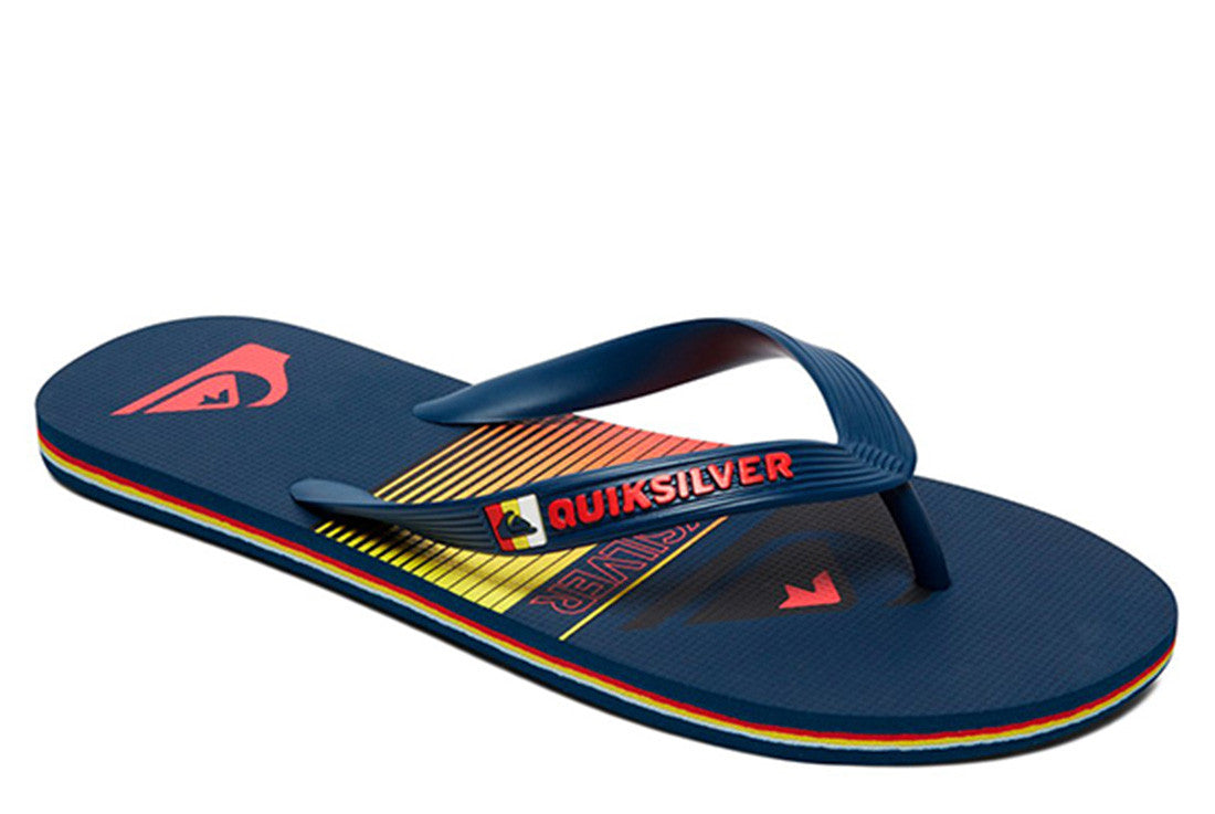 Gender :Mens Color :Blue/Red/Blue- Flexible 3 point synthetic rubber strap with Quiksilver wordmark and fine mold Mountain Wave logo - Slip resistant textured footbed - Pop color pin lines in sidewall tying into colorway - Re- engineered blown rubber outsole incorporates multi angled logo lugs for added traction Quiksilver Mens Molokai Thongs - Flip-flops for men featuring Quiksilver branding and fine mould mountain & wave logo, a slip-resistant textured insole.