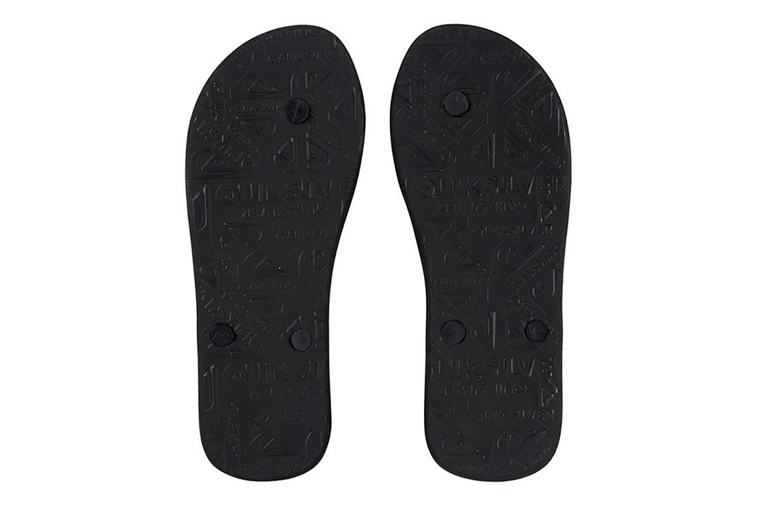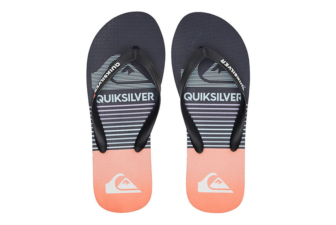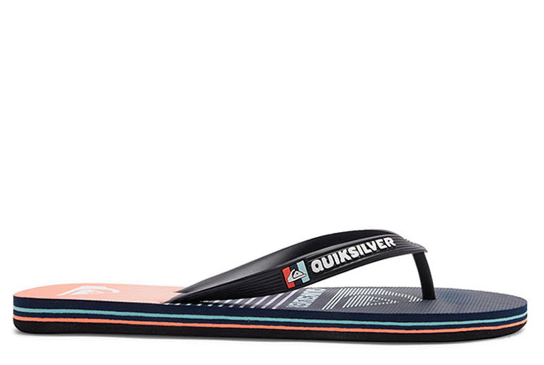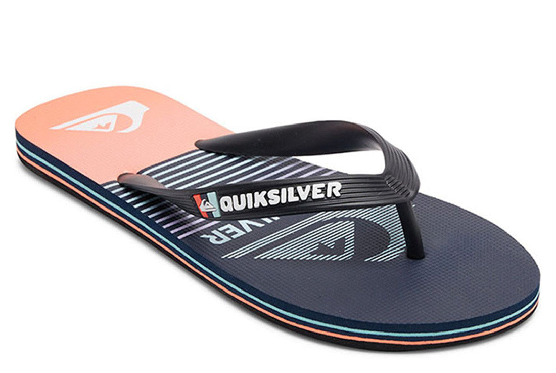 - Flexible 3 point synthetic rubber strap with Quiksilver wordmark and fine mold Mountain Wave logo - Slip resistant textured footbed - Pop color pin lines in sidewall tying into colorway - Re-engineered blown rubber outsole incorporates multi anglednlogo lugs for added tractionQuiksilver Mens Molokai Thongs - Flip-flops for men featuring Quiksilver branding and fine mould mountain & wave logo, a slip-resistant textured insole.