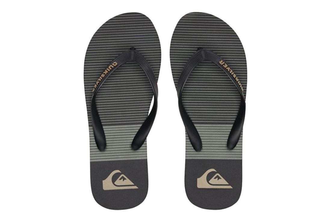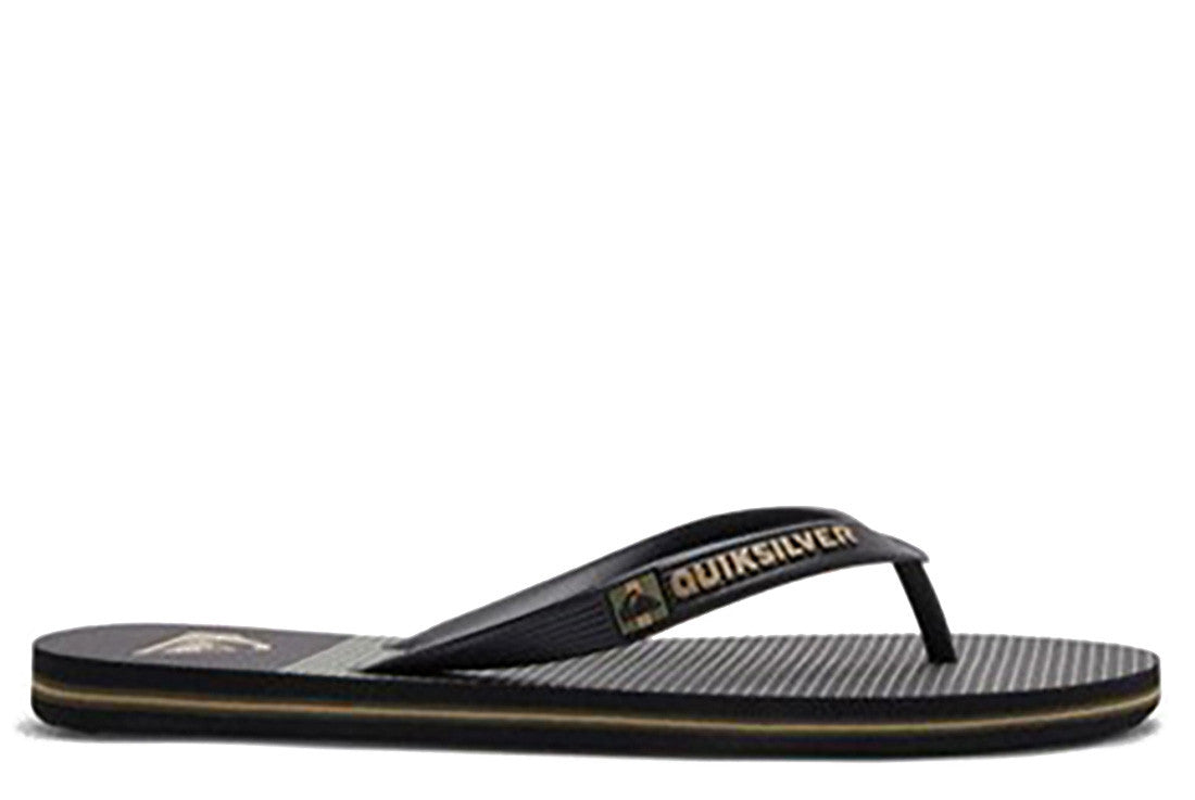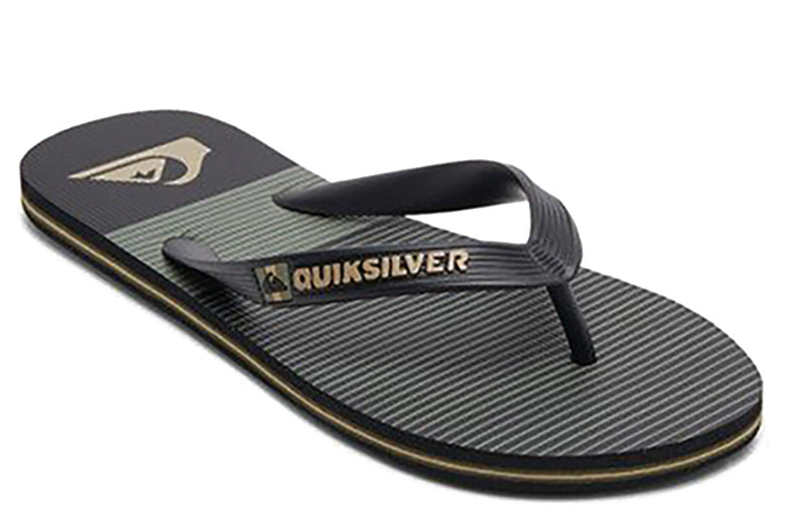 Gender :Mens Color :Black/Green/Black- Flexible 3 point synthetic rubber strap with Quiksilver wordmark and fine mold Mountain Wave logo - Slip resistant textured footbed - Pop color pin lines in sidewall tying into colorway - Re- engineered blown rubber outsole incorporates multi angled logo lugs for added traction Quiksilver Mens Molokai Thongs - Flip-flops for men featuring Quiksilver branding and fine mould mountain & wave logo, a slip-resistant textured insole.