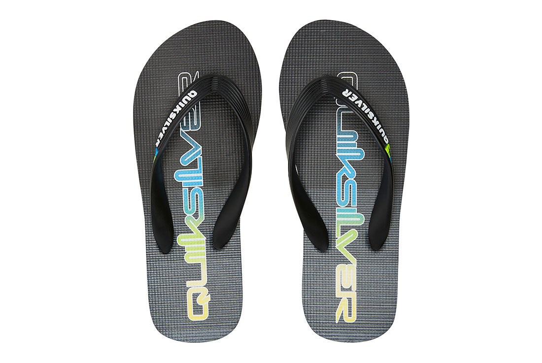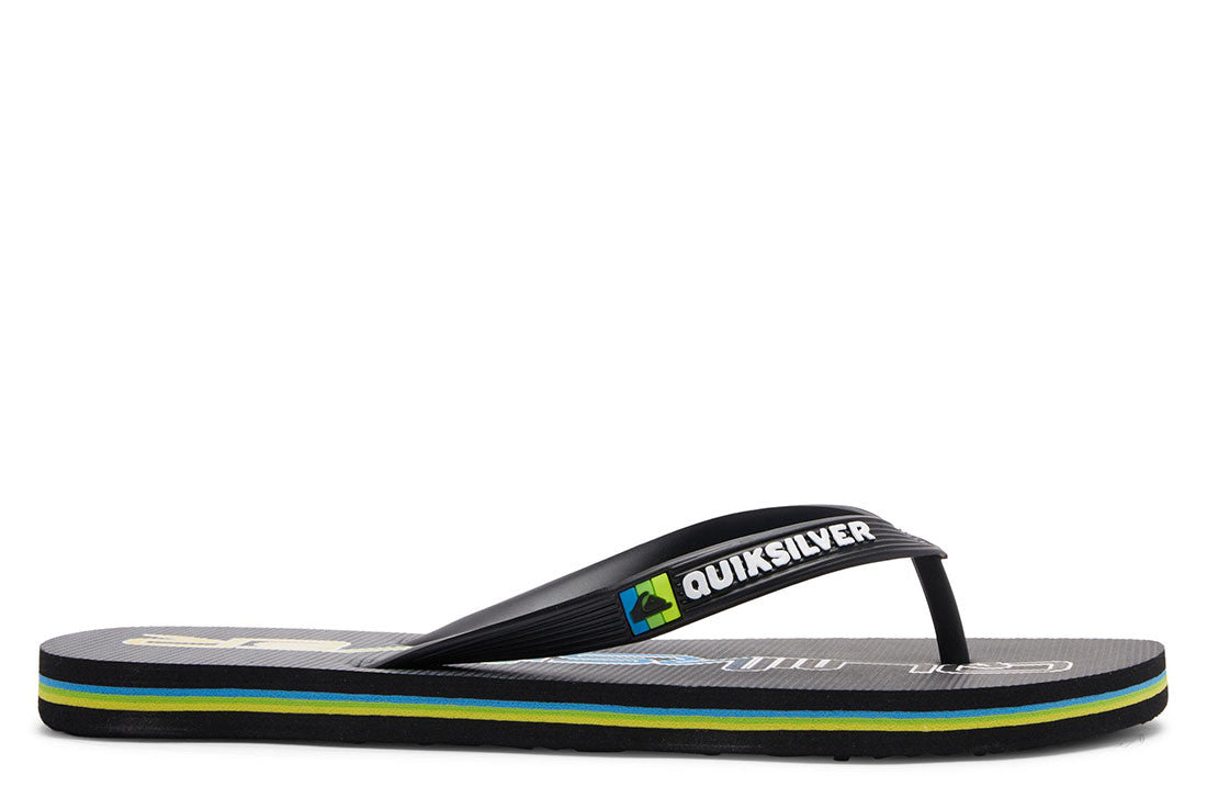 - Flexible 3 point synthetic rubber strap with Quiksilver wordmark and fine mold Mountain Wave logo - Slip resistant textured footbed - Pop color pin lines in sidewall tying into colorway - Re- engineered blown rubber outsole incorporates multi angled logo lugs for added traction Quiksilver Mens Molokai Thongs - Flip-flops for men featuring Quiksilver branding and fine mould mountain & wave logo, a slip-resistant textured insole.