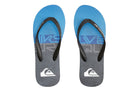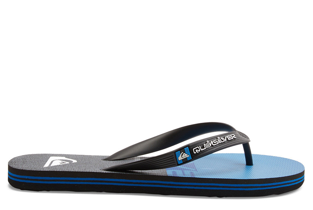 Gender :Mens Color :Black/Blue/Grey - Combo- Flexible 3 point synthetic rubber strap with Quiksilver wordmark and fine mold Mountain Wave logo - Slip resistant textured footbed - Pop color pin lines in sidewall tying into colorway - Re- engineered blown rubber outsole incorporates multi angled logo lugs for added traction Quiksilver Mens Molokai Thongs - Flip-flops for men featuring Quiksilver branding and fine mould mountain & wave logo, a slip-resistant textured insole.