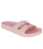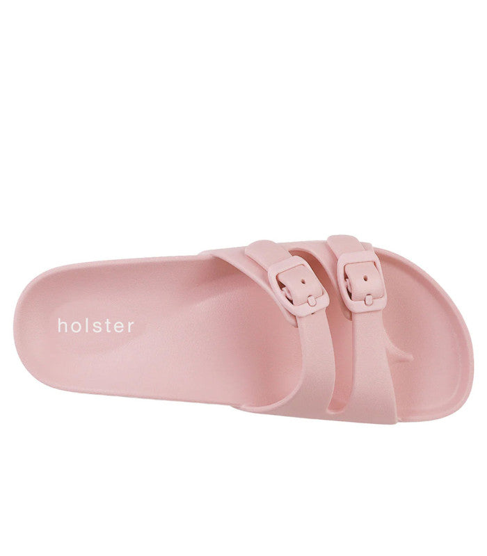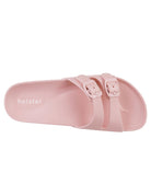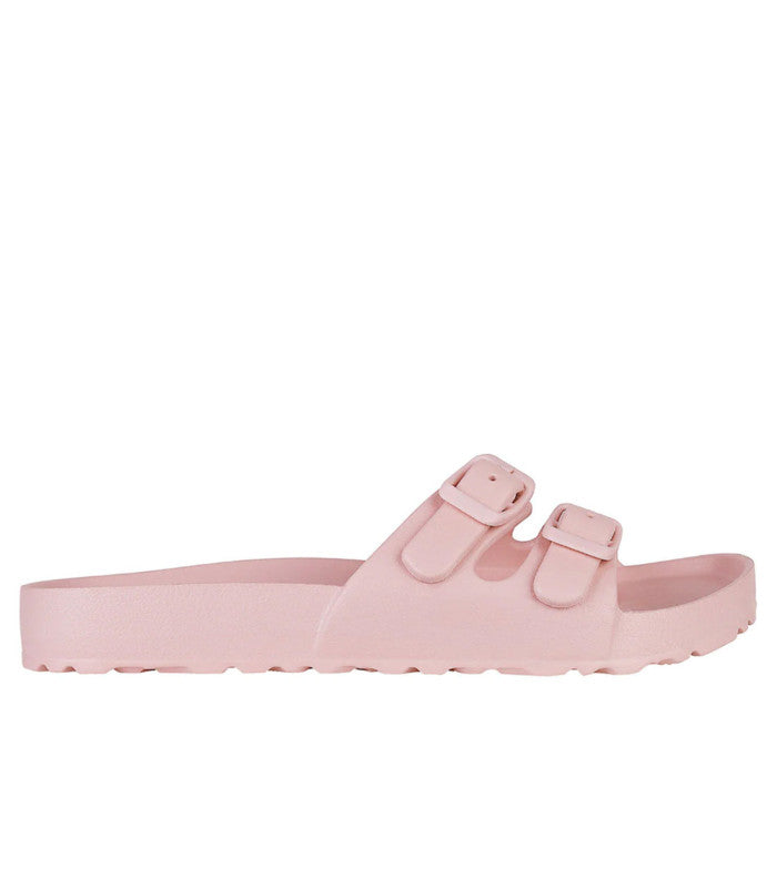 Each colour-matched buckle has a flat backing which sits smoothly against the skin for an easy slide on, slide off shoe.