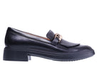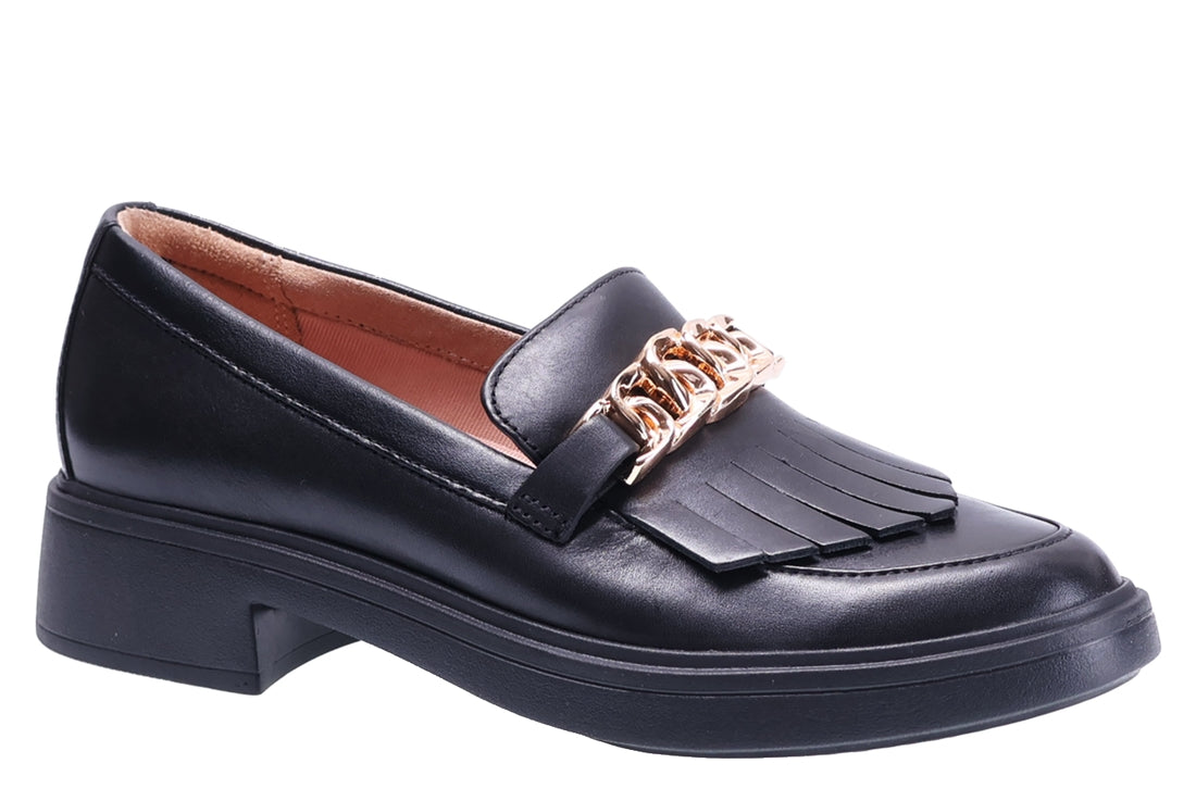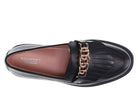 Featuring a kiltie fringe and gold chain detail, it offers a stylish twist on the traditional loafer, suitable for both professional and casual settings.